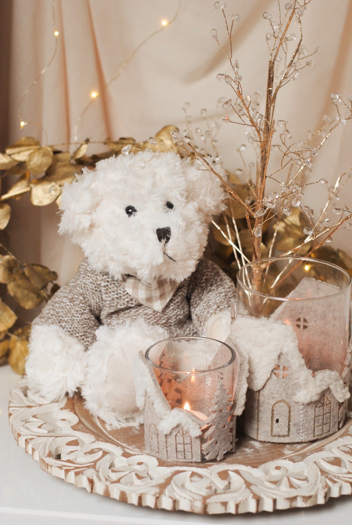 Deze prachtige theelichthouder is omringd door schattige vilten huisjes met wollen dakjes en kerstboompjes ertussen. Zó zacht, zó gezellig - een mini winterdorpje op zich! ✨