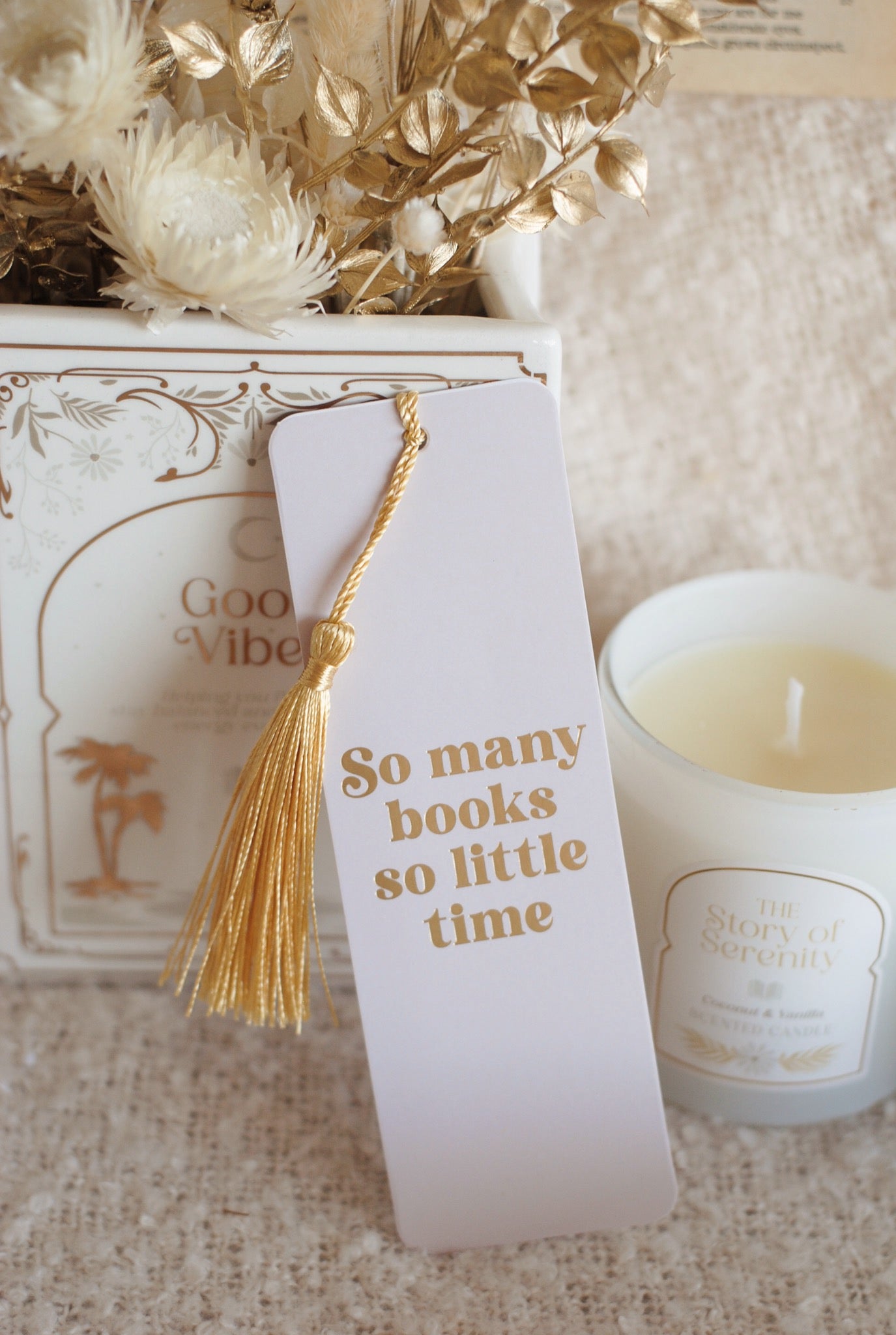 So many books, so little time! ✨ Deze bladwijzer combineert een gold foil quote met een zachte, dansende tassel - ideaal om je favoriete pagina snel terug te vinden! 📖💫
