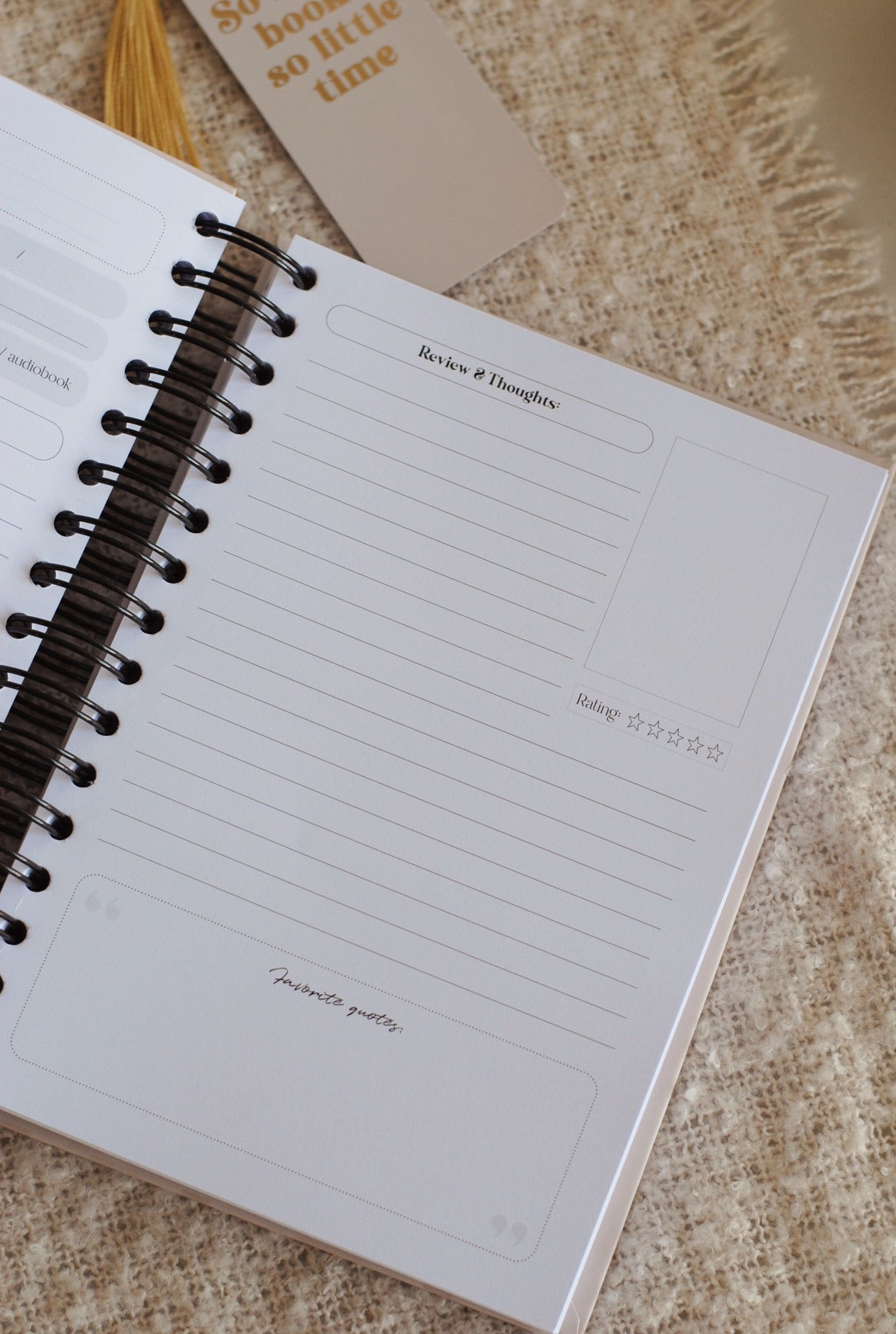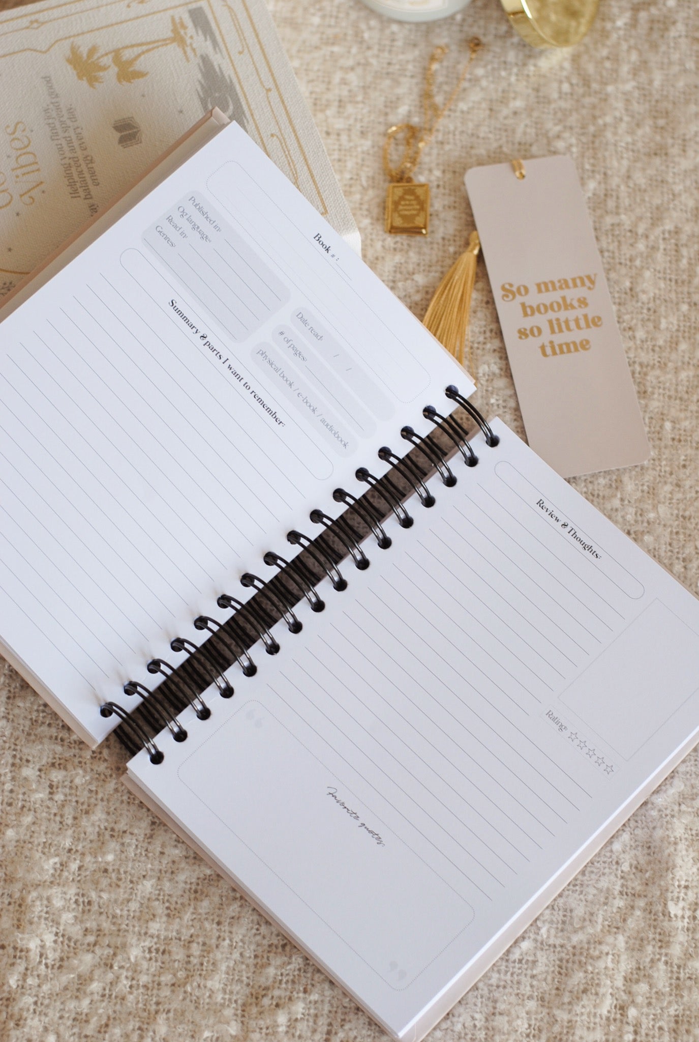 -Dan heb je de review pagina's! Als eerste kan je "Book .." invullen = het hoeveelste boek dat je leest dat jaar. Een handig kadertje waarin je de titel en auteur kan noteren en een kader met plaats voor: wanneer is het gepubliceerd (jaartal), wat is de originele taal, in welke taal heb je het gelezen, genre(s), datum gelezen, aantal pagina's, format en de rating! En dan is er heel veel plaats voor je korte inhoud, review en gedachten! Ook een plaats om eventueel de boekcover te plakken en een kader voor je favoriete quotes! (Er zijn 80 review pagina's!)