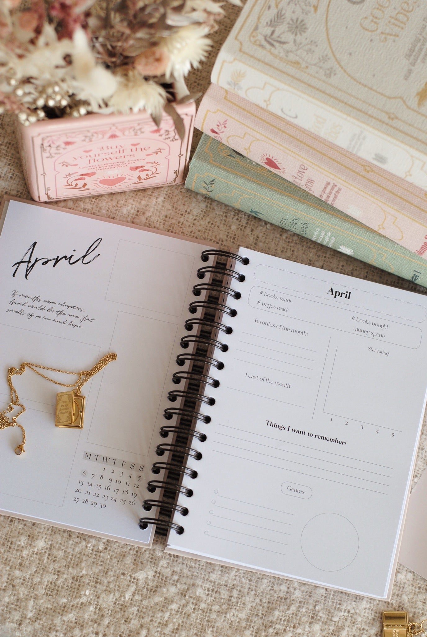 -Na de trackers is er een pagina met 'boeken gelezen in "maand"' 12 plaatsen met weer sterretjes en pagina's! Bovenaan de pagina kan je het aantal boeken en het totaal aantal pagina's noteren! Naast deze pagina is er een 'boeken gekocht' pagina!