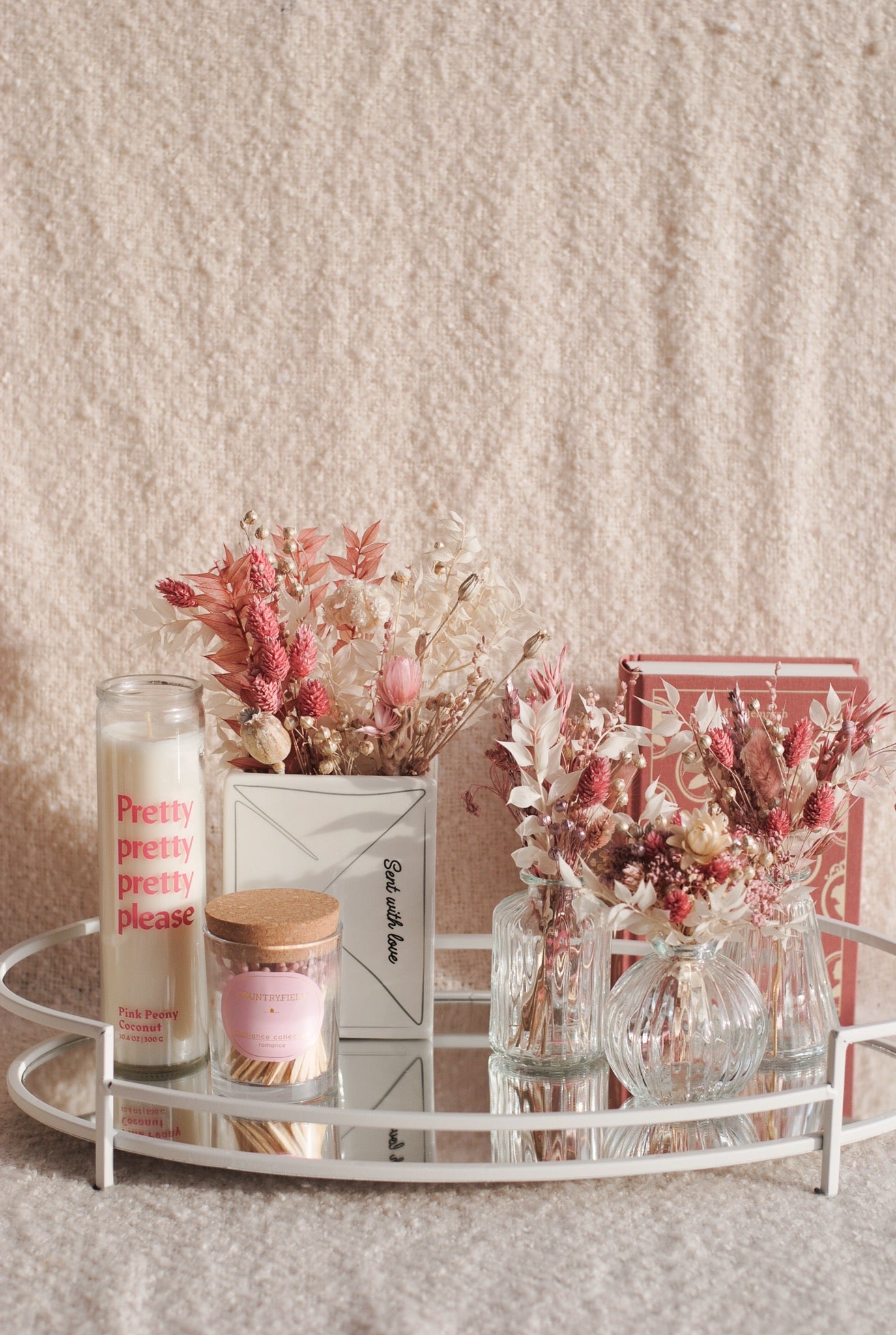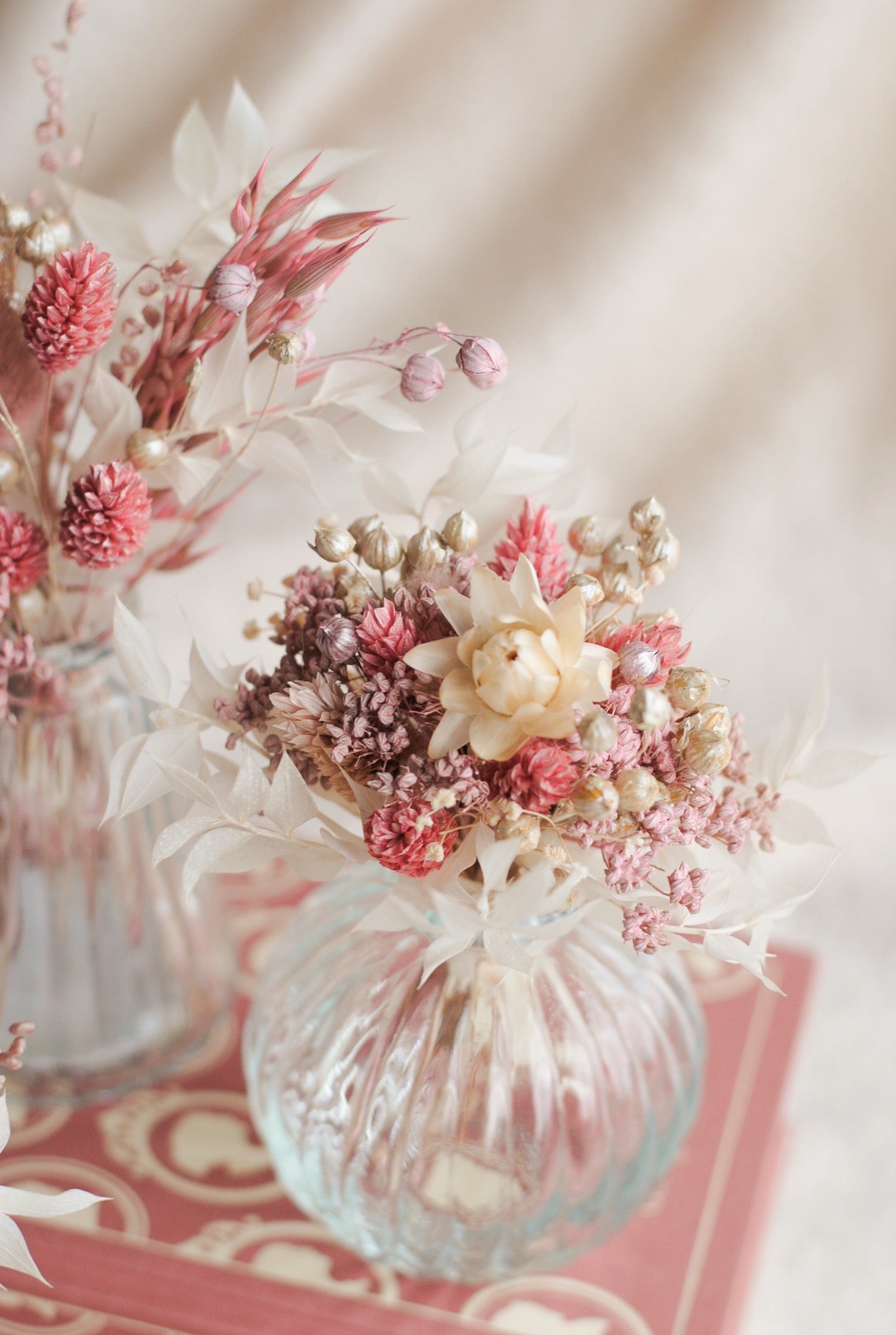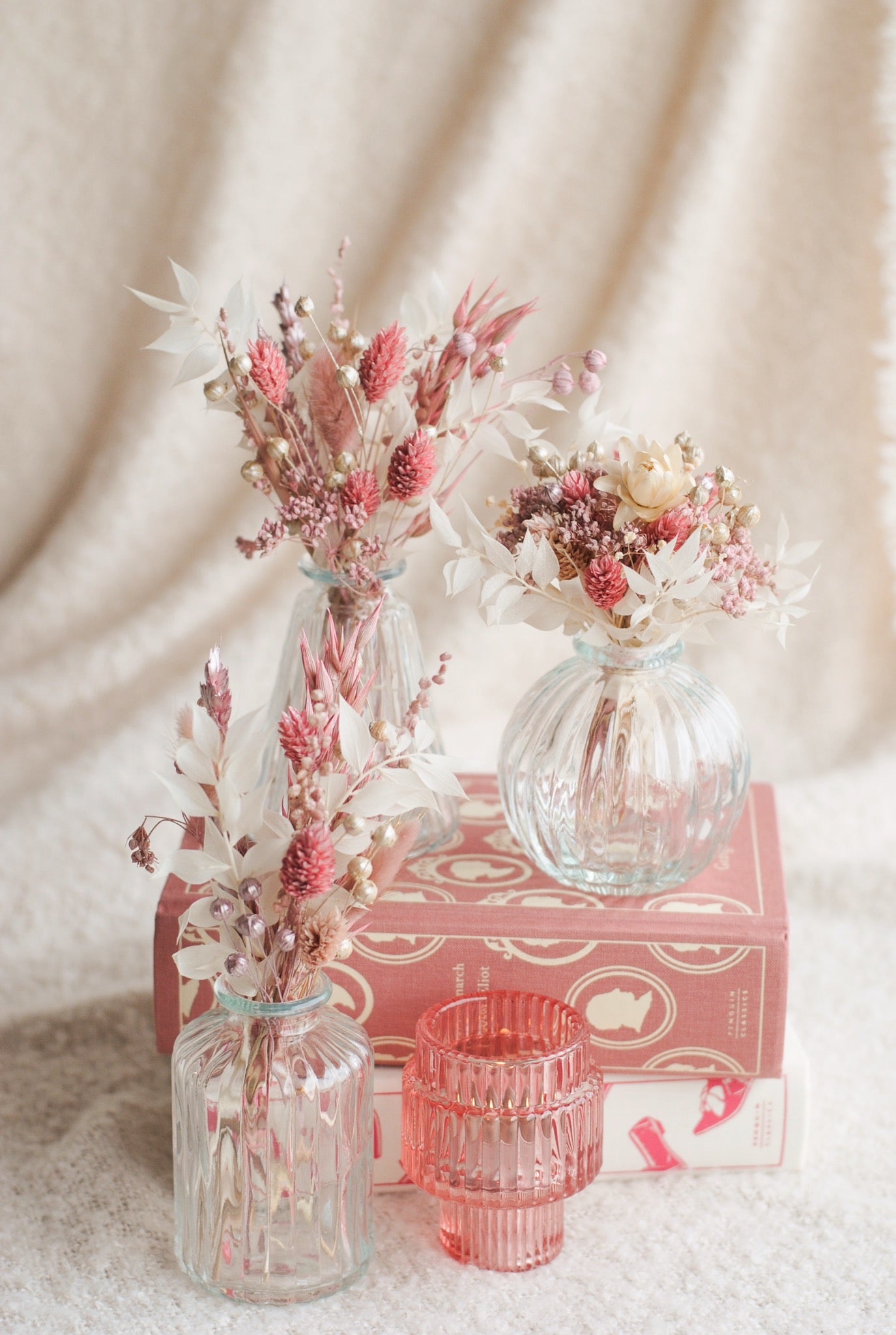 Vrolijk roze boeketjes in drie verschillende glazen vaasjes! Perfect om vrolijkheid in huis te brengen en op een bijzettafel te zetten, bij je lentedecoratie of in groep voor een gezellig hoekje vol zachte kleur en textuur. 🌸🤍✨