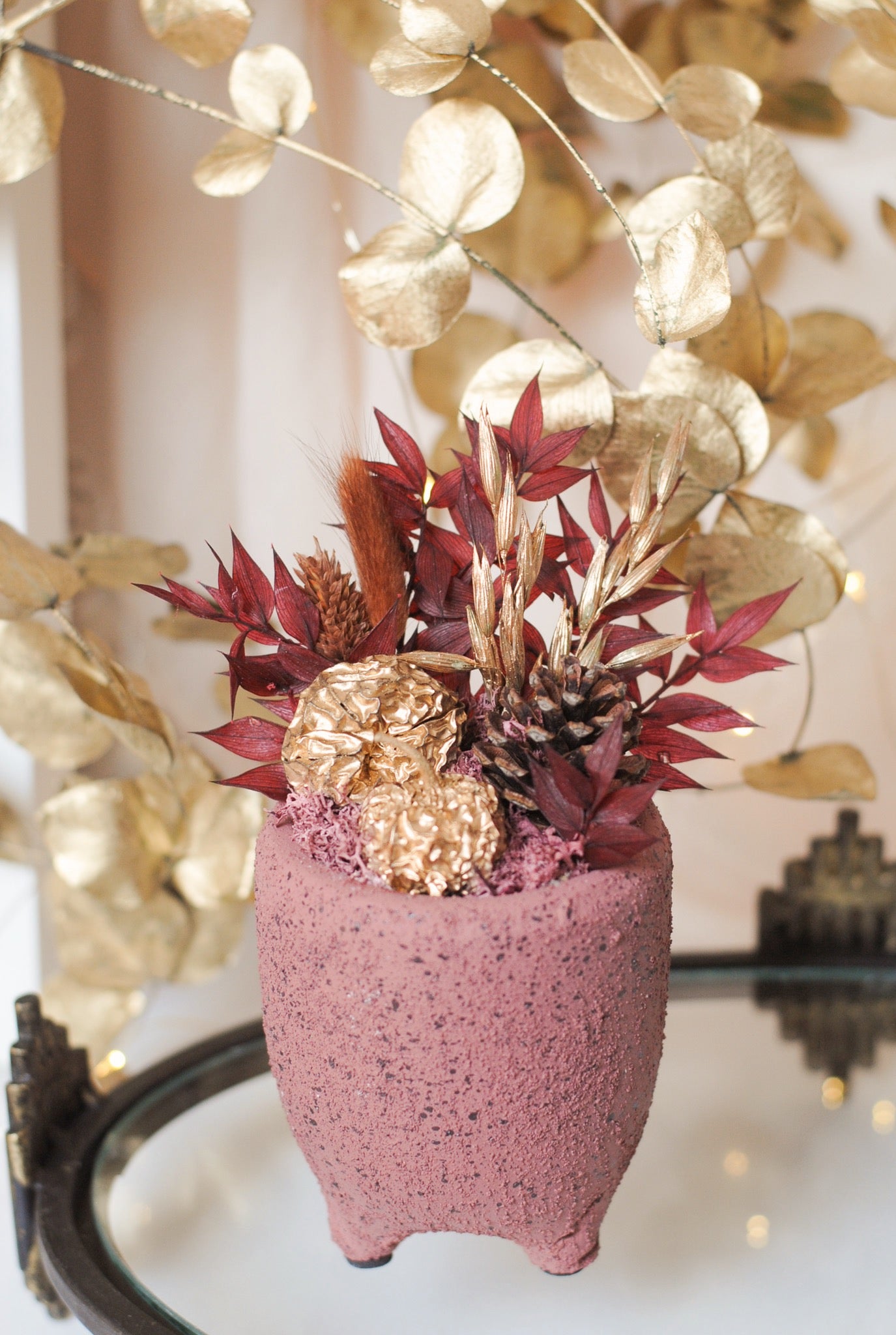 Een gezellig herfstbloemstukje met pompoentjes in prachtige leggy maroon planter! ✨
