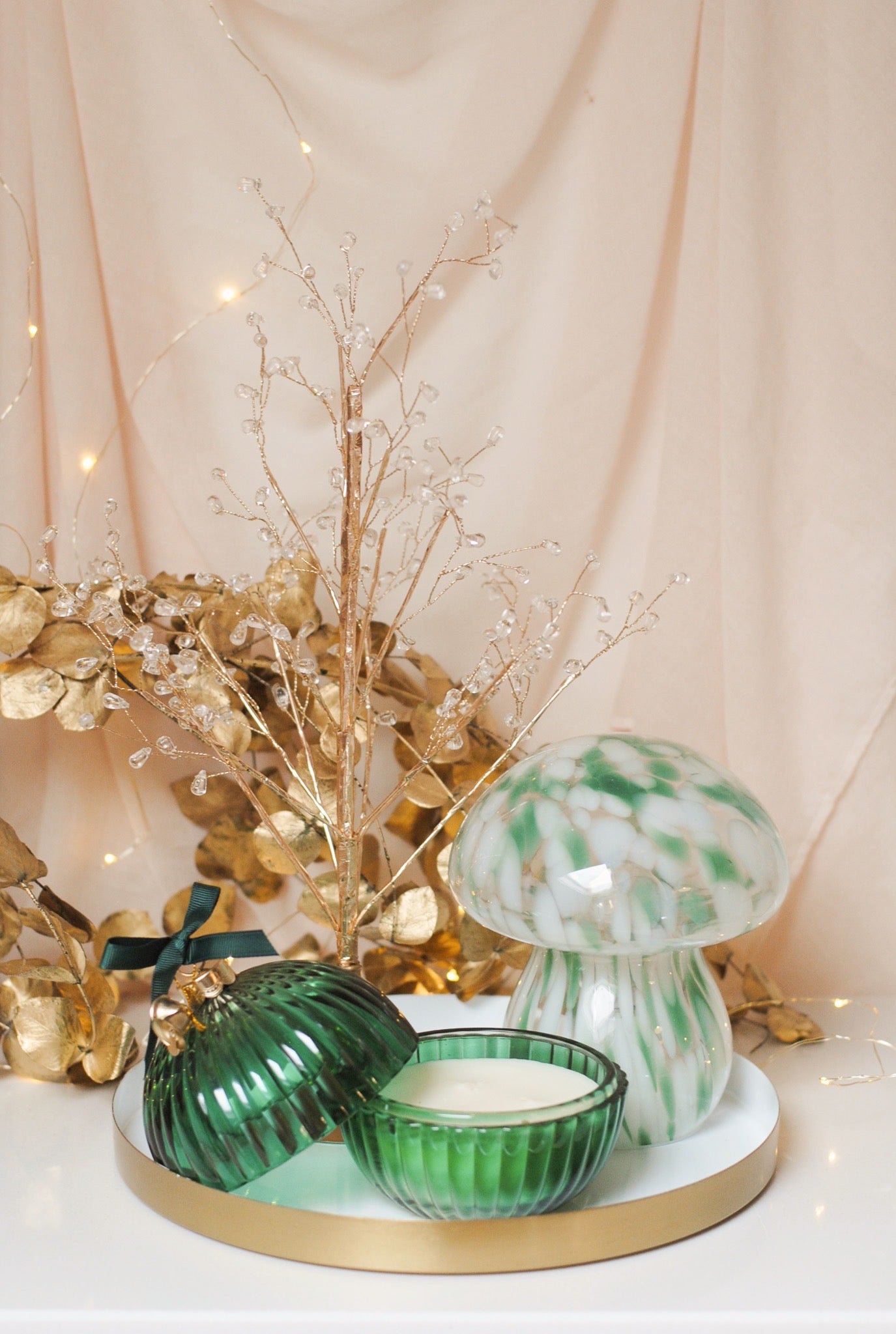 Deze paddenstoellamp van glas combineert zachte groentinten met subtiele witte vlekken, geïnspireerd op het bos! 🍄 Met warm licht op batterij brengt hij rust, sfeer en herfst in elk hoekje van je huis. Geen stopcontact nodig! ✨